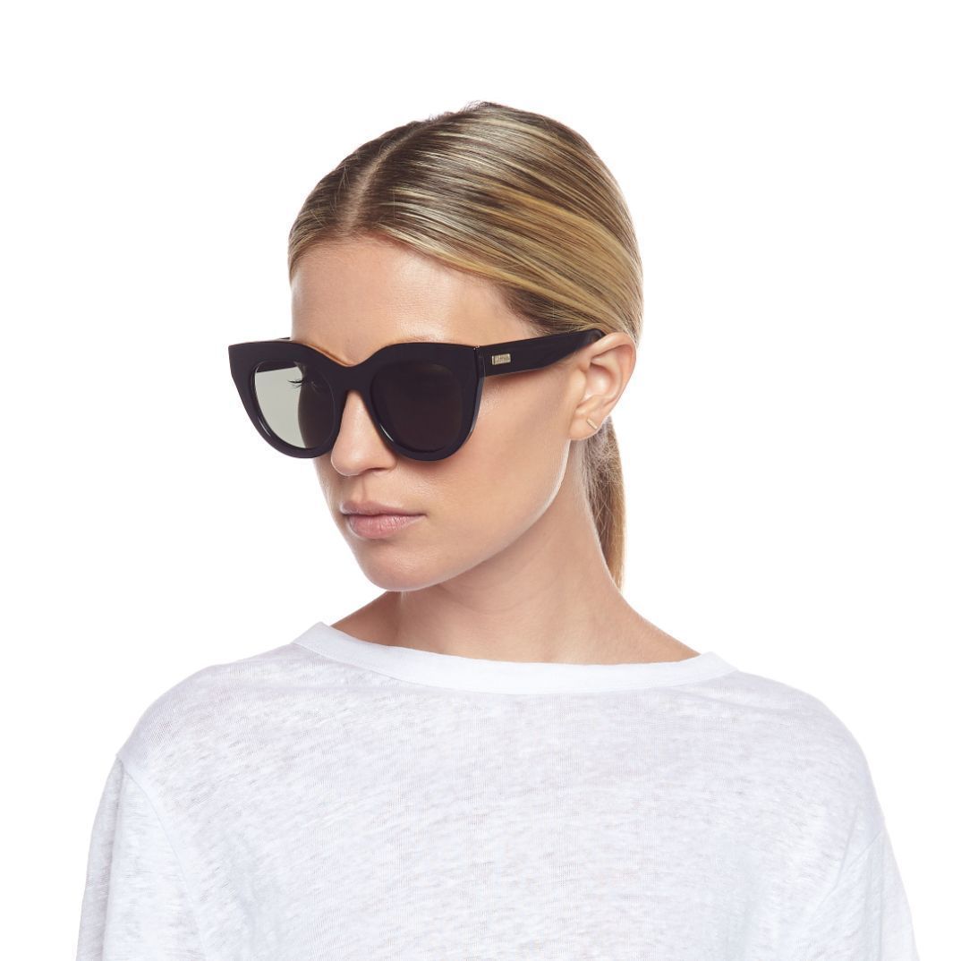 A favourite of Meghan Markle and Olivia Palermo, the Air Heart silhouette is an iconic Le Specs style. With proportions reminiscent of a cat eye, the style is designed in thick black and luxurious metal top bar inlay, then fitted with premium zero base khaki flat lenses. The perfect sunglass to suit all face shapes.
