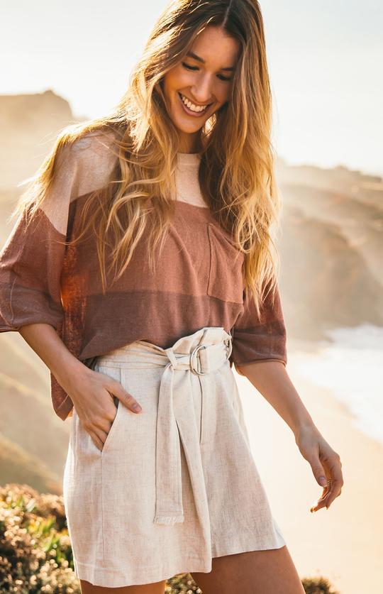 The Alpha short is made of a linen blend that is perfect for warm weather. These shorts are high-waisted with an elasticated back, slash pockets and a removable belt.