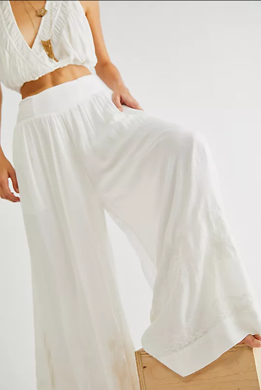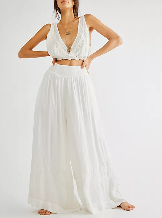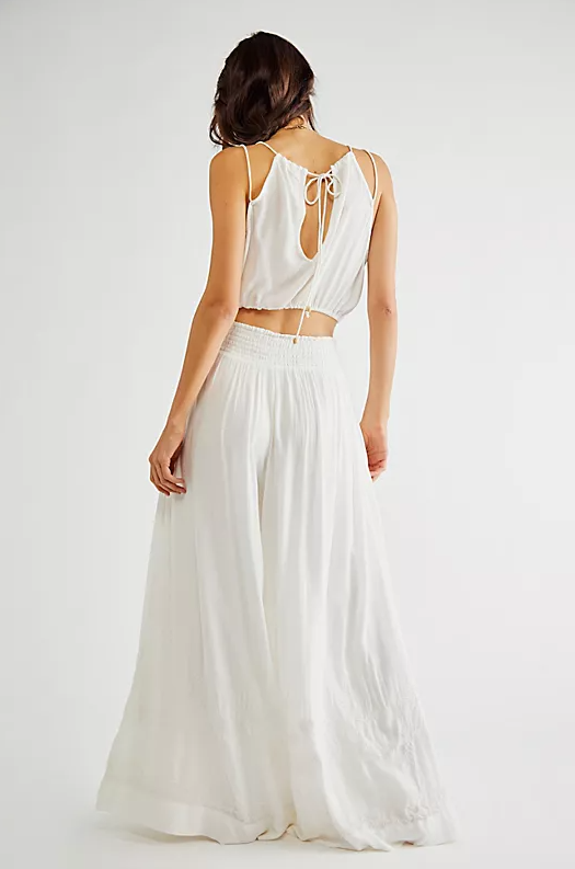 The set you will be wearing absolutely everywhere featuring drapey, V-neck cropped top and matching high-rise, wide-leg pants for the most effortless look no matter the occasion.