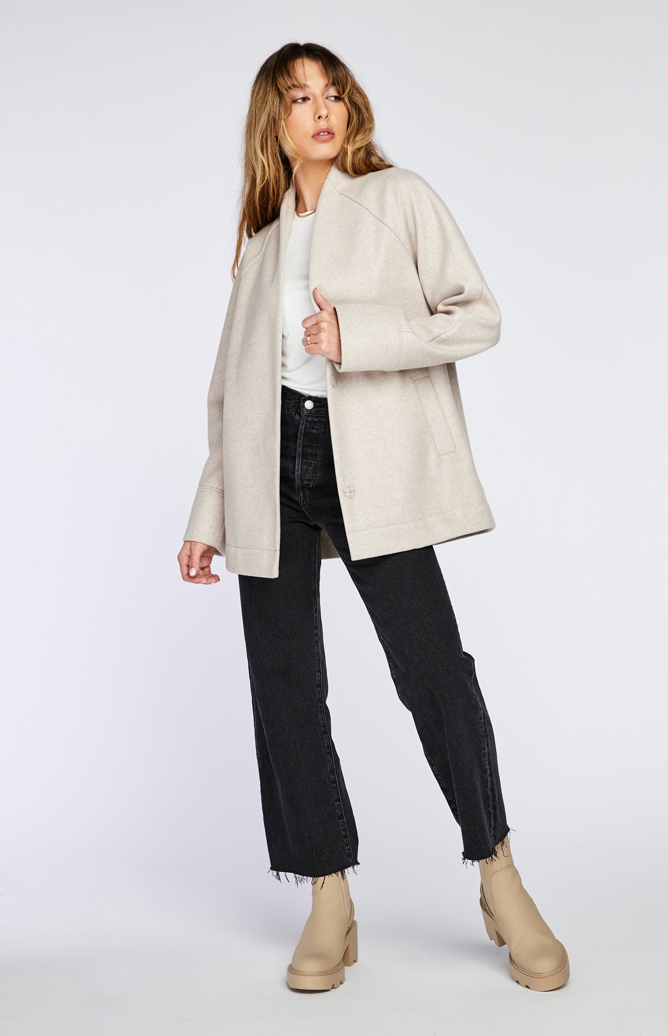 The Carolina coat is made of a soft, brushed fabric. Features include a shawl collar, welt pockets, and a hidden snap front closure.