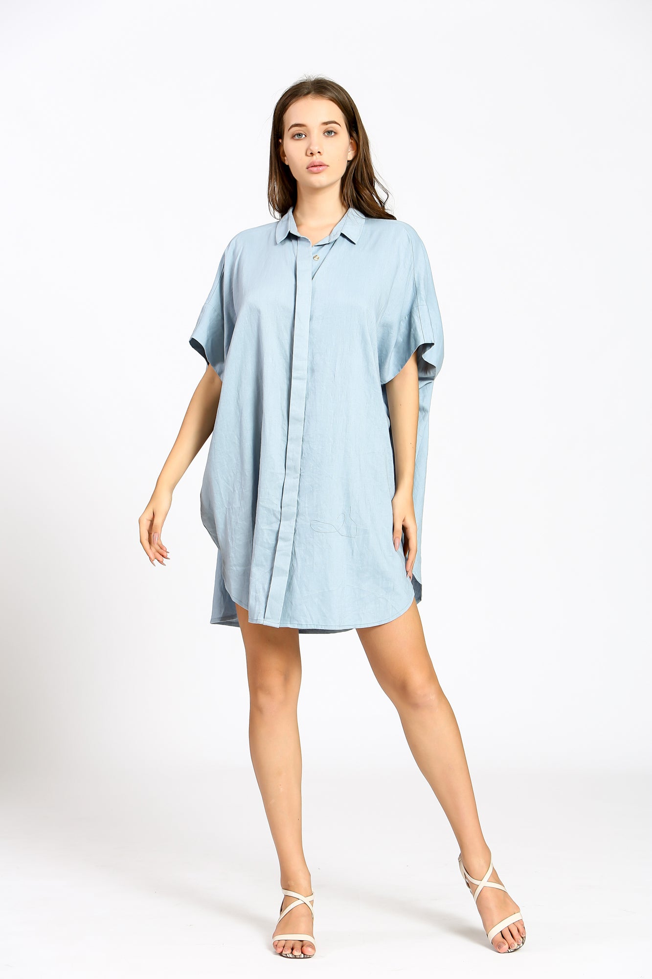 The Jade Shirt Dress is made of lightweight linen blend and features a button down design with a collar. This dress is perfect for a comfortable and stylish day out.