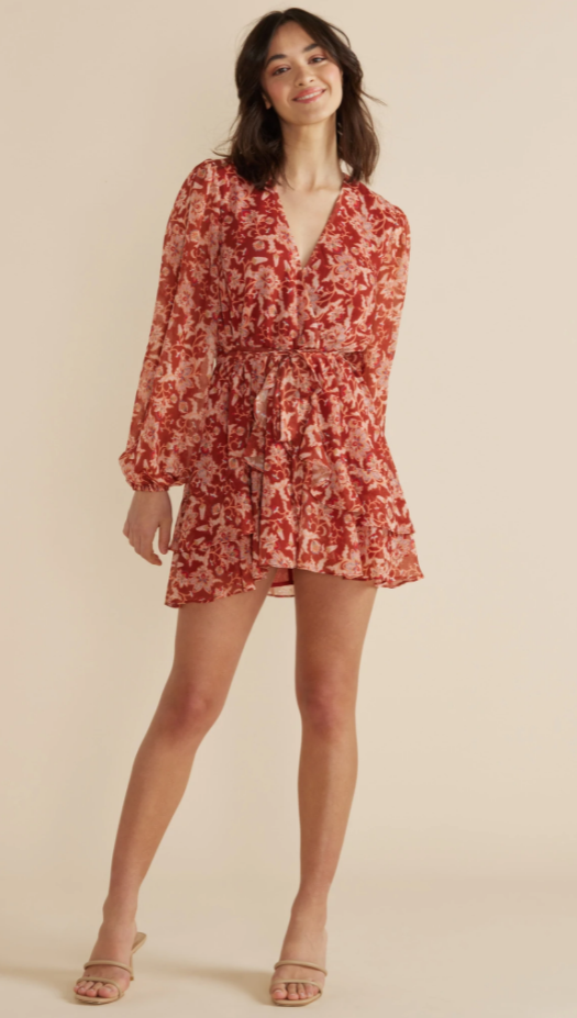 The Dover Mini Dress features full length sleeves, a waist tie and frill details. Our classic mini dress silhouette in a stunning autumnal print.