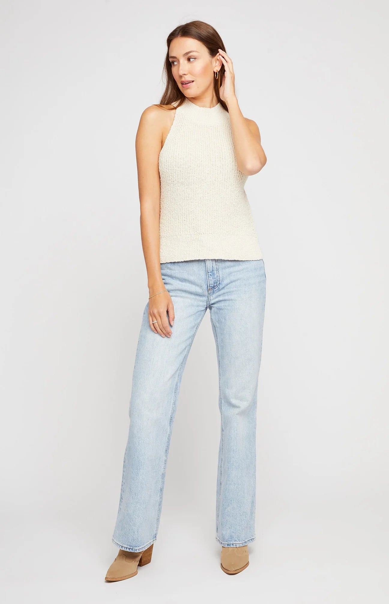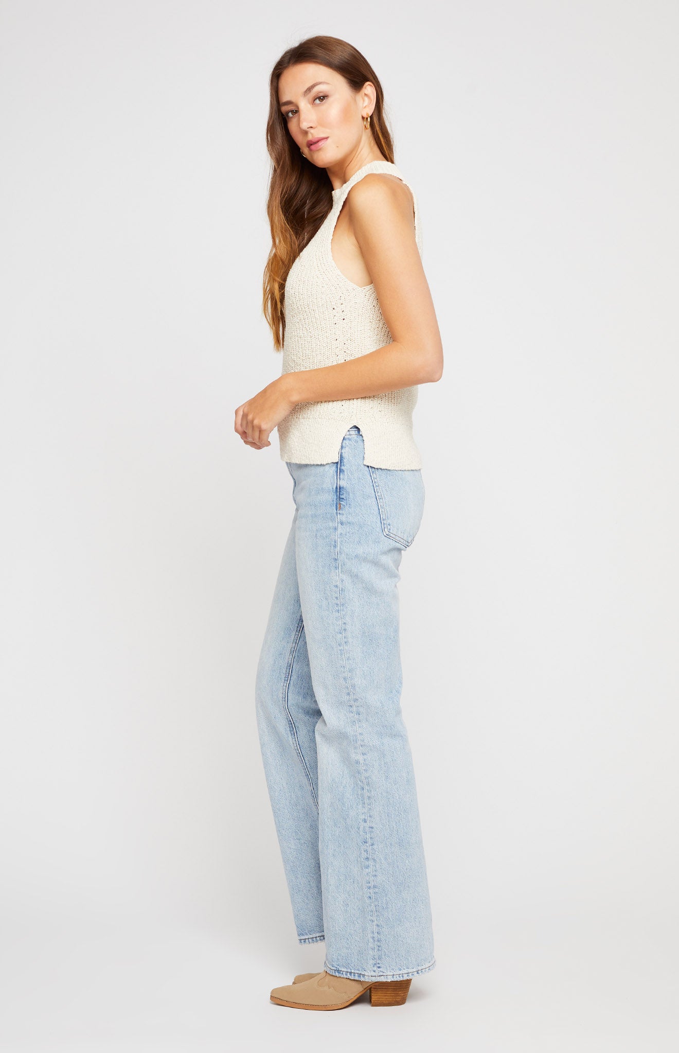 The Jasper tank is made of a soft yarn with a slubby texture. Features include a halter neckline, pointelle stitch details, and side slits.