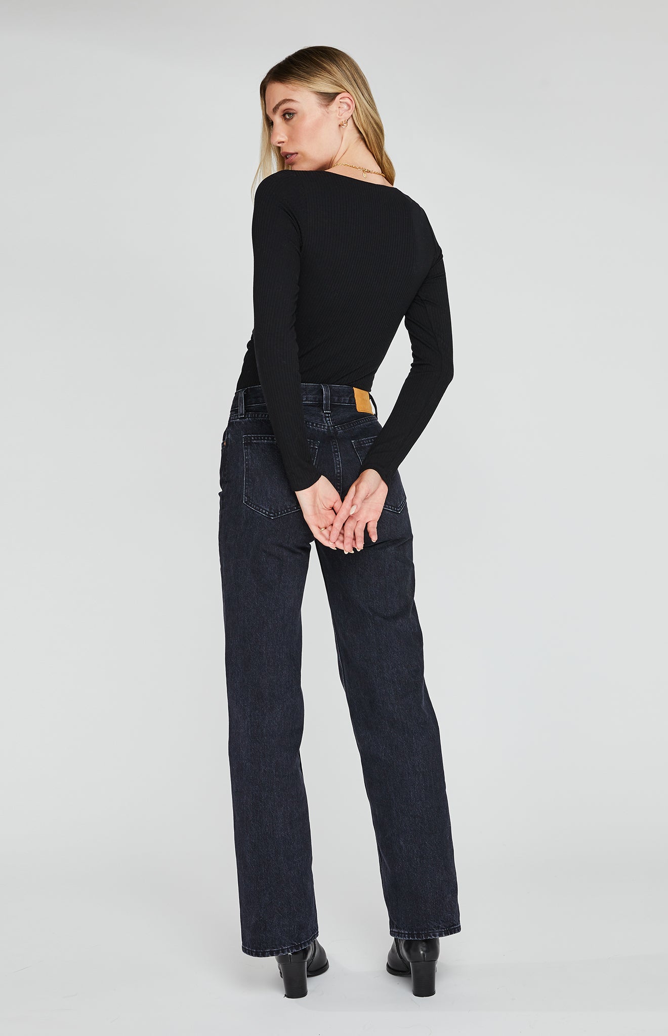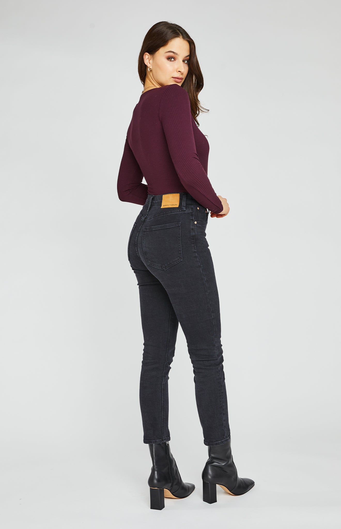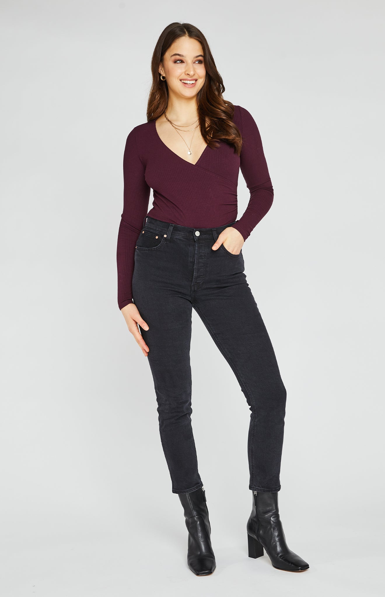 The Madeira bodysuit is made of a stretchy ribbed fabric that hugs the body. Features include a wrap neckline and thong-cut bottom with an adjustable snap closure.