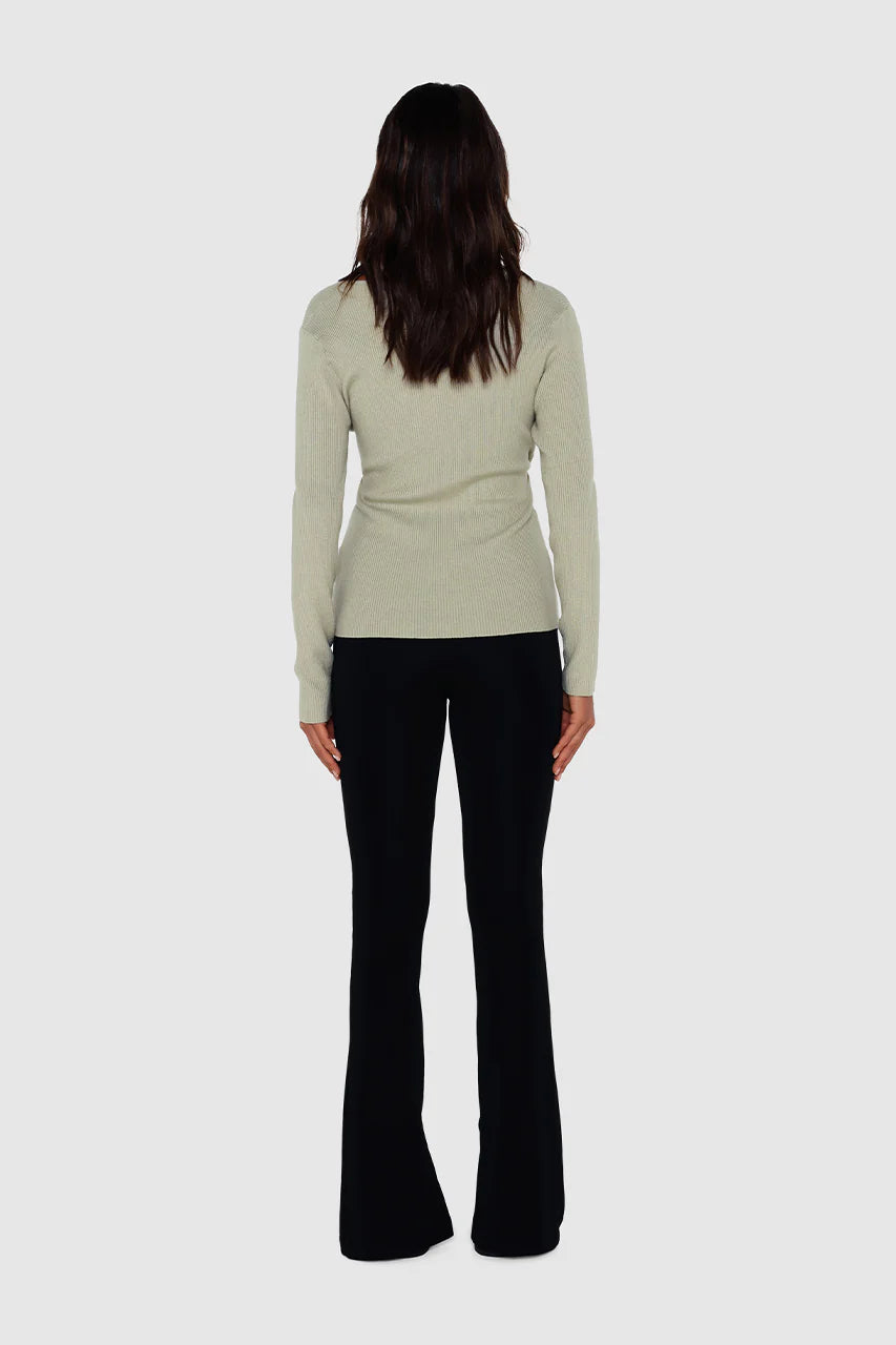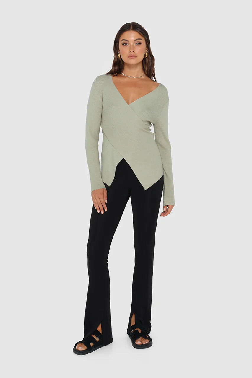 The Marley knit top is a feminine take on knitwear. Crafted from a luxurious soft knit fabric, it boasts a classic pale green hue, long sleeves, and a flattering fitted silhouette. The V-neckline is accented with an elegant cross-over front to complete the picture of sophistication. Refined yet eye-catching, the Marley top is perfect for any occasion.