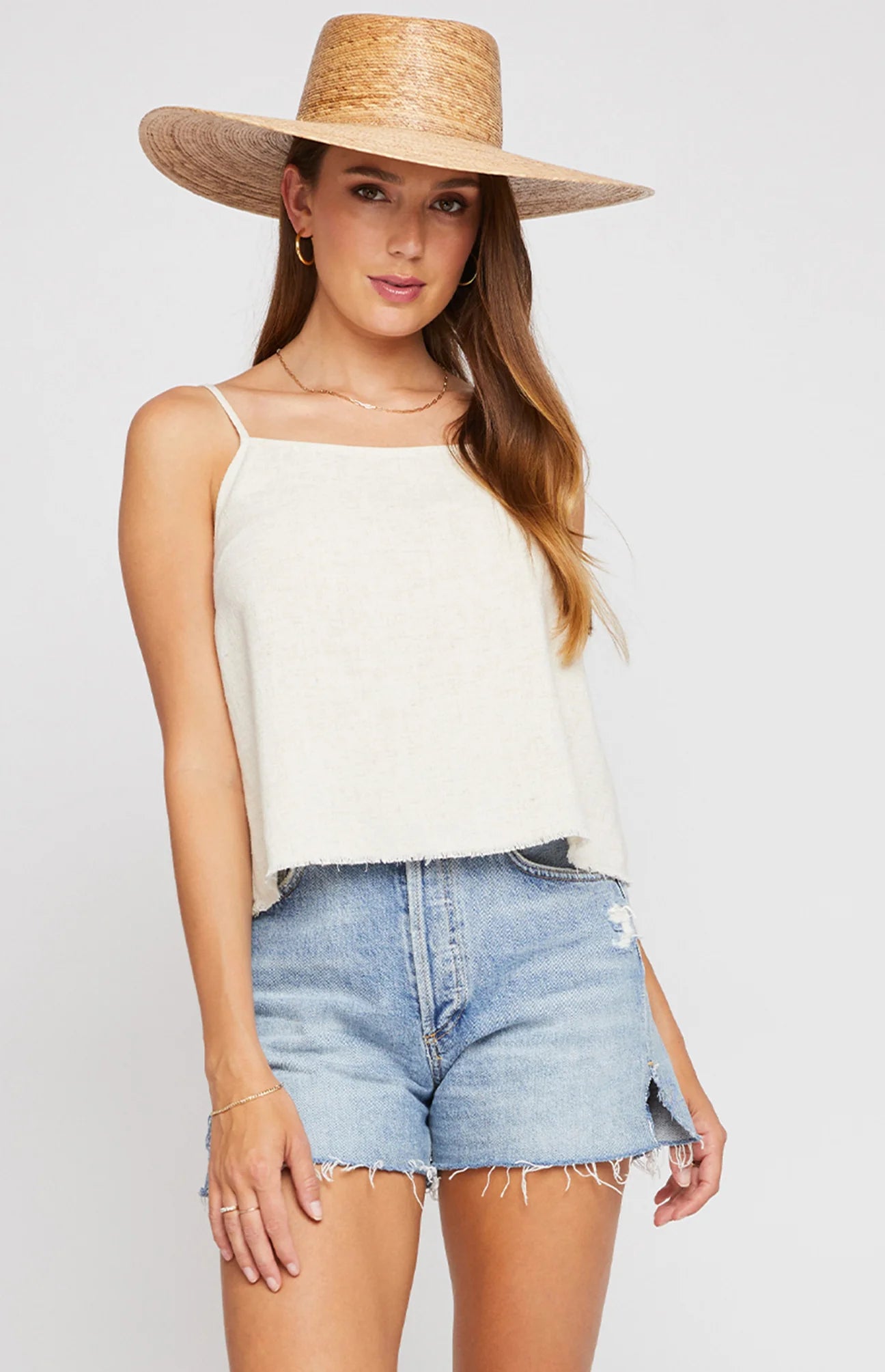 The Mikah tank is made of a linen blend that is perfect for warm weather. Features include adjustable straps, raw edge hemline, and a crossover back detail. Complete the look with the Willow pant.