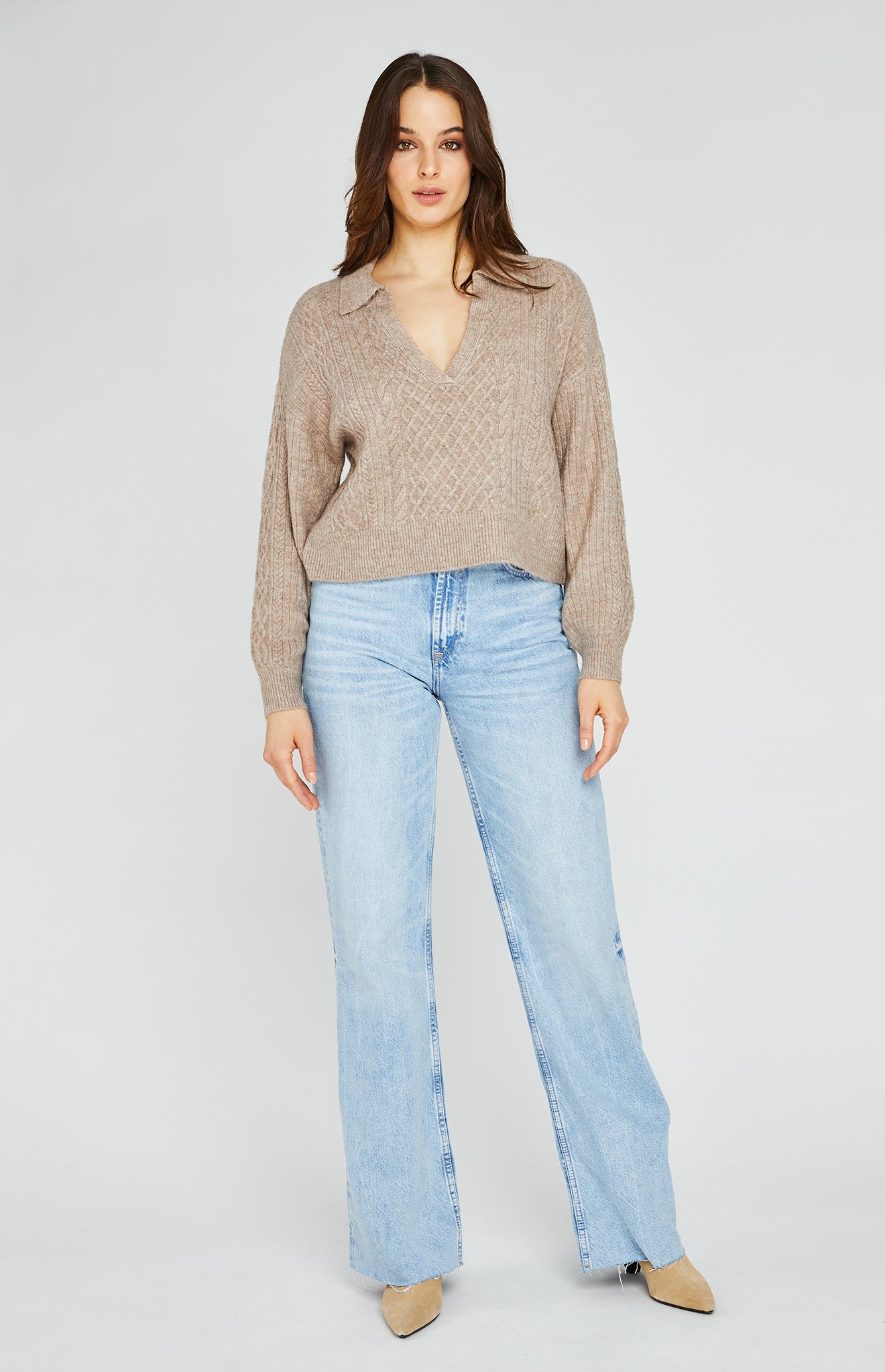 The Napa sweater is made of a soft and cozy yarn. Features include a collar with a half placket and cable knit stitch details throughout.