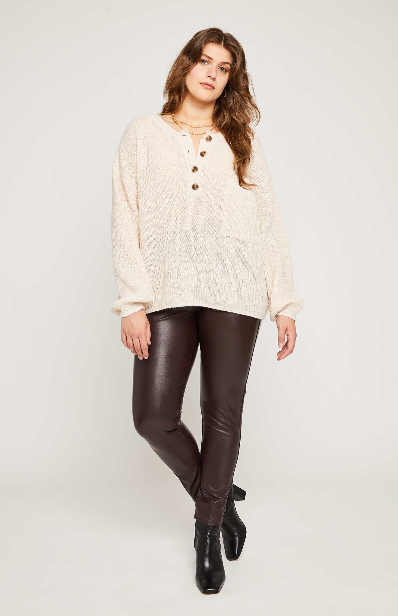 The Oracle is a high rise legging made of a textured leatherette. Features include an elasticated waistband, patch pockets, and seaming details throughout. The versatile silhouette can be styled casually or dressed up for date night.