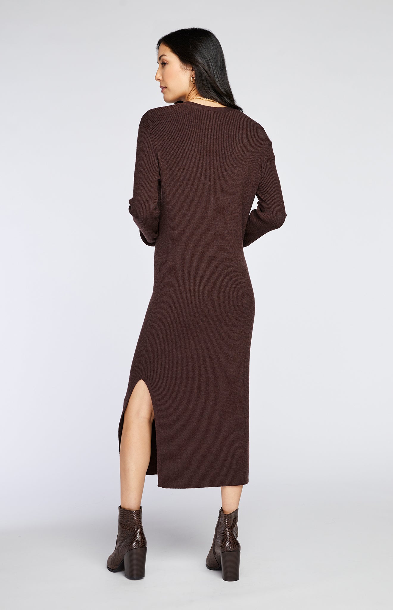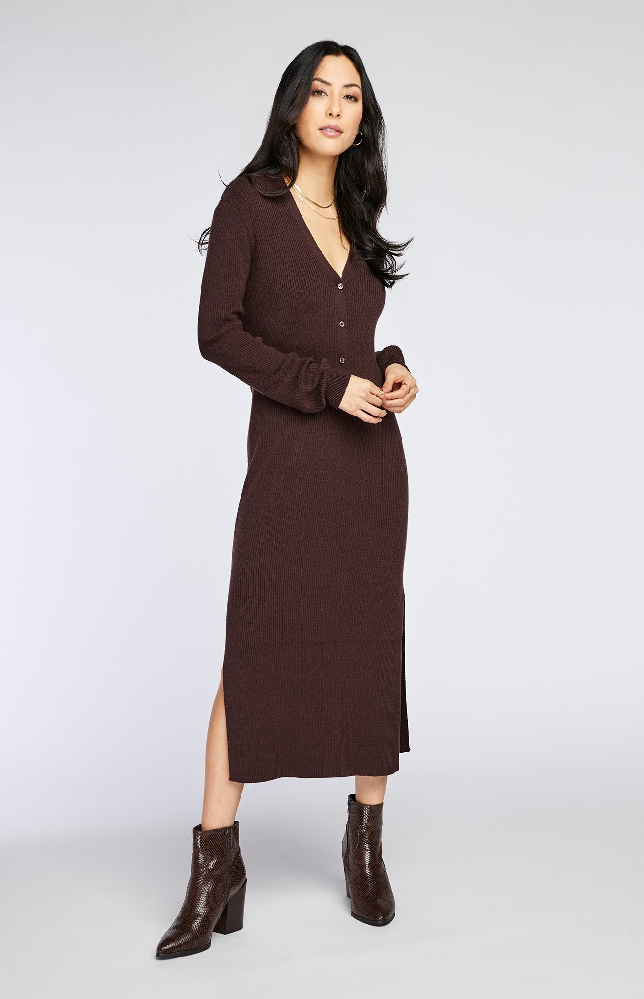 The Penny dress is made of a soft yarn with a ribbed texture. Features include a v-neckline with button closure and midi-length with side slits.