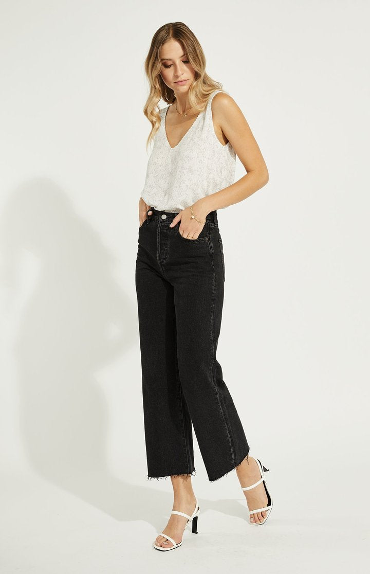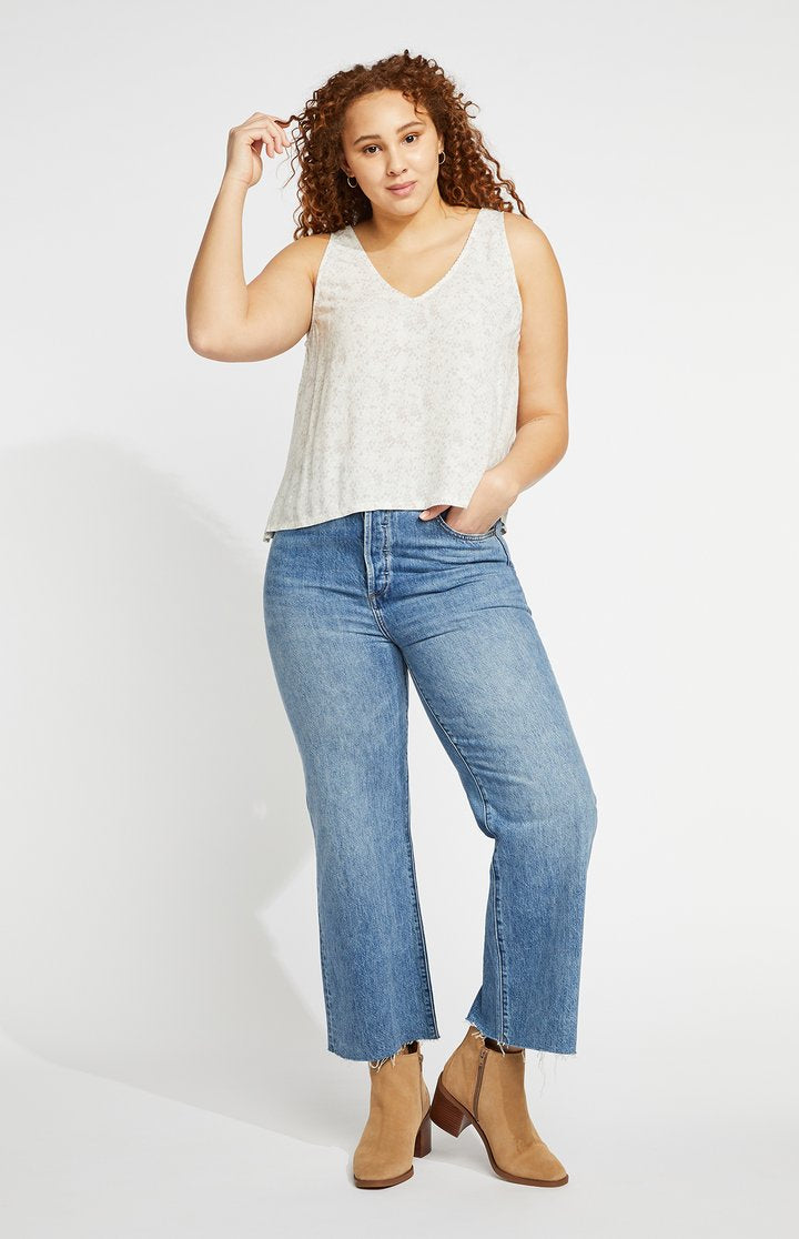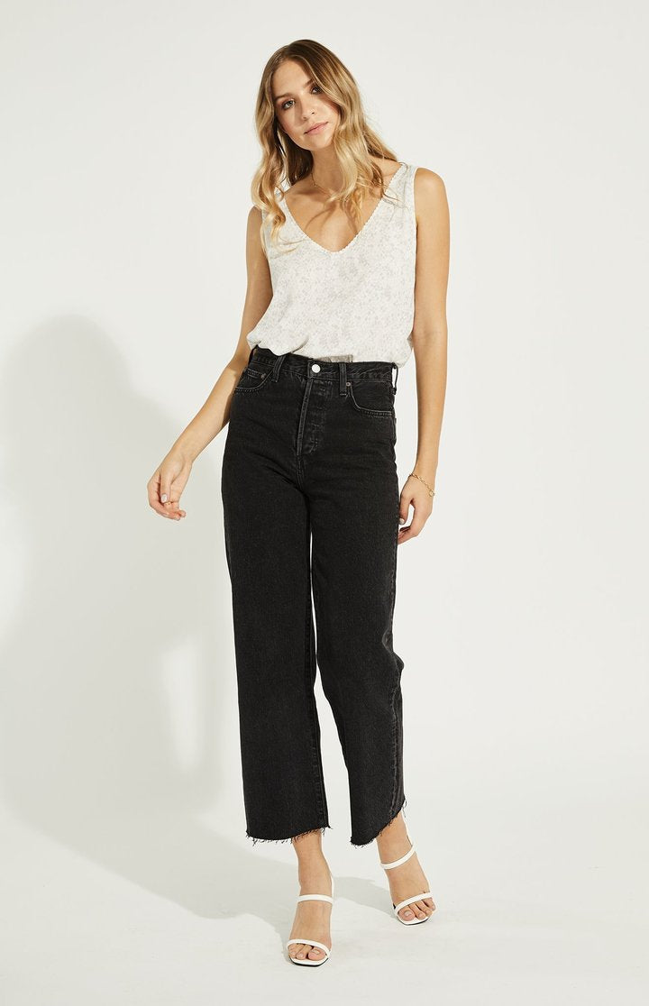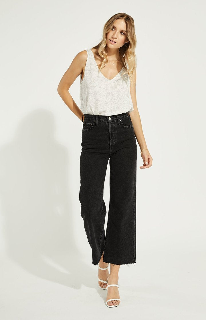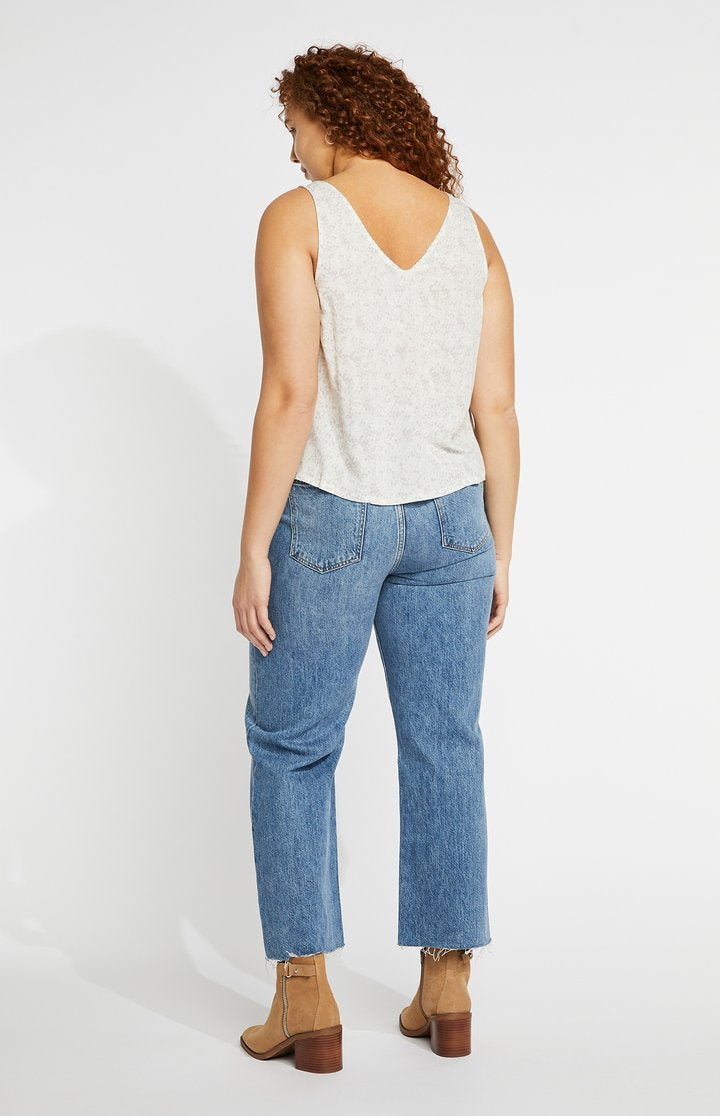 The Scenery tank features a subtle snake print and v-neckline with a delicate scalloped edge. Wear it as is or tucked into high-waisted denim.