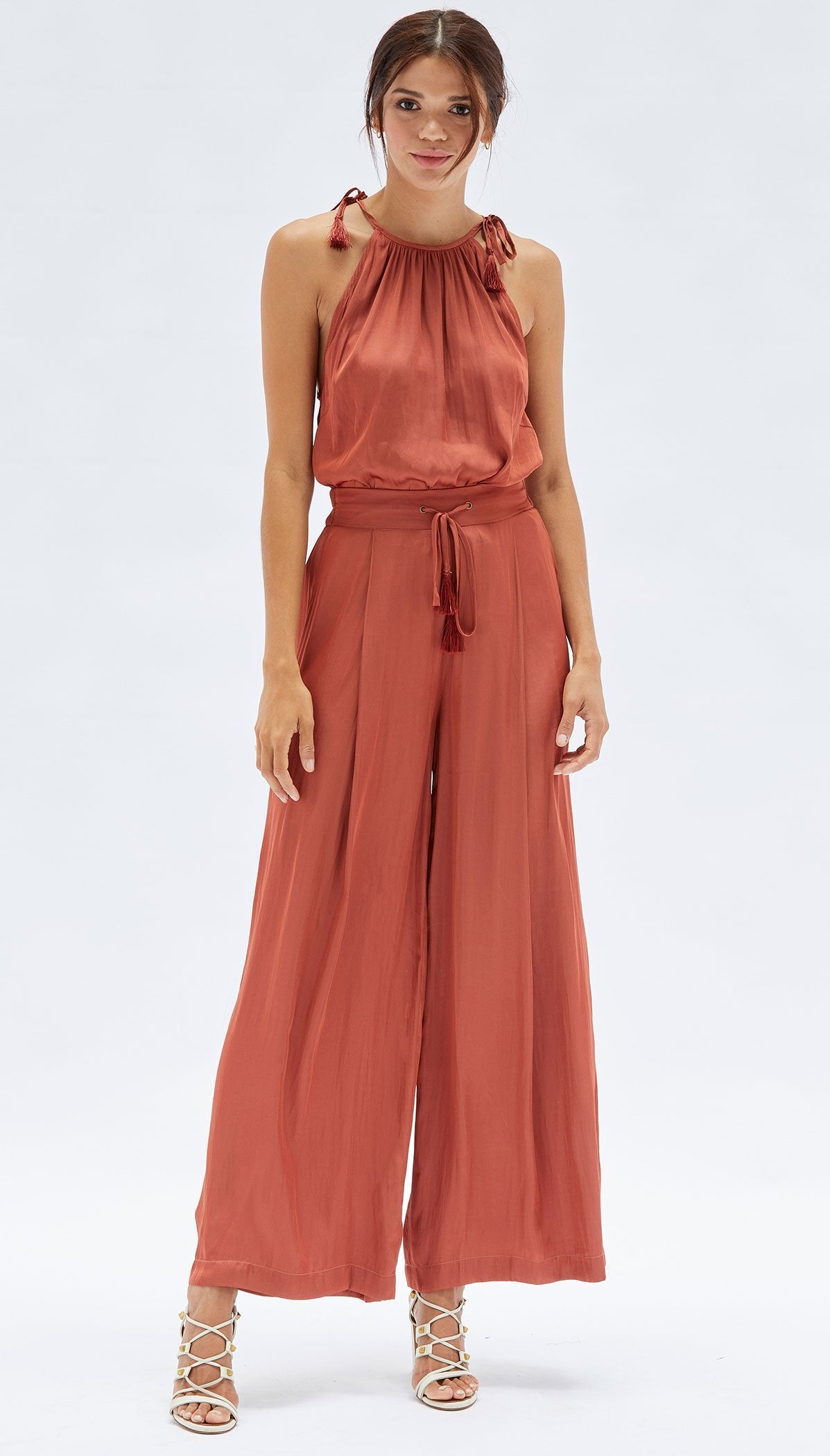 • High racer shape neckline with gathered fabric at front and back and soft fabric ties on shoulders finished with tassels
