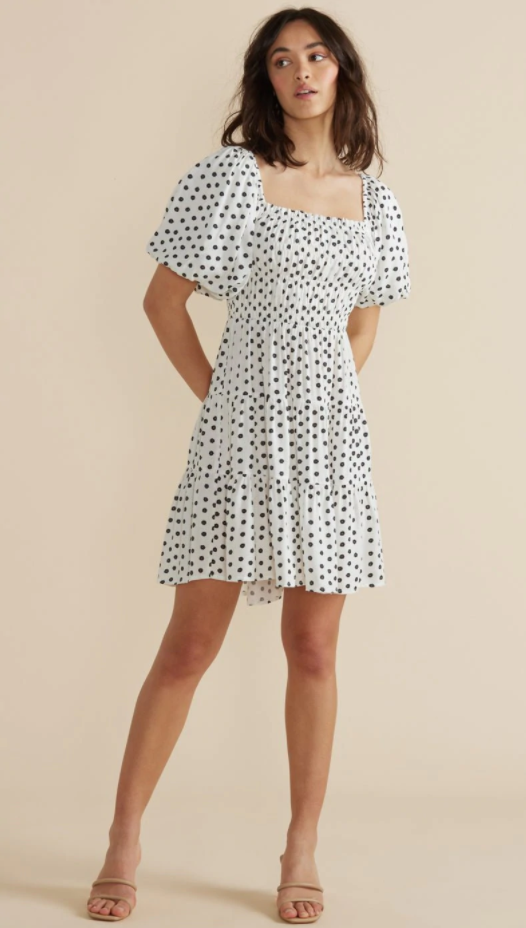 Featuring puff sleeves and a shirred elastic bodice in a spotted floral print, our Tidal Dress is a timeless and stylish summer mini. Wear yours with heels out to lunch or to a casual event.