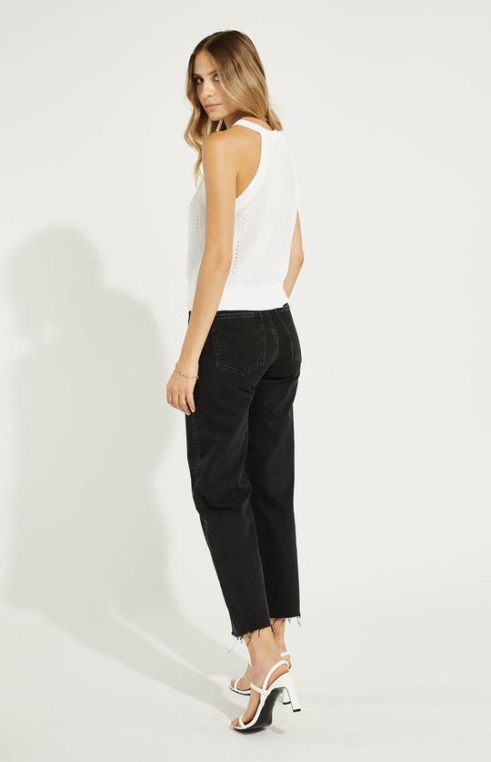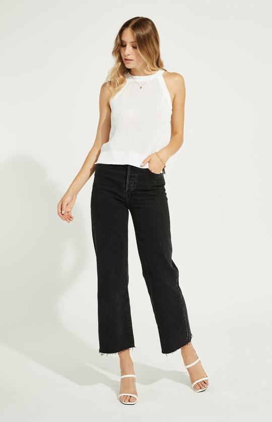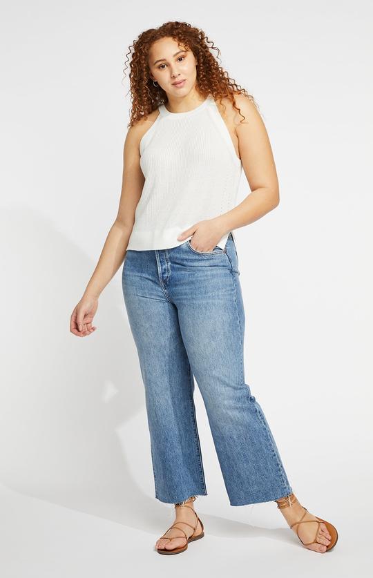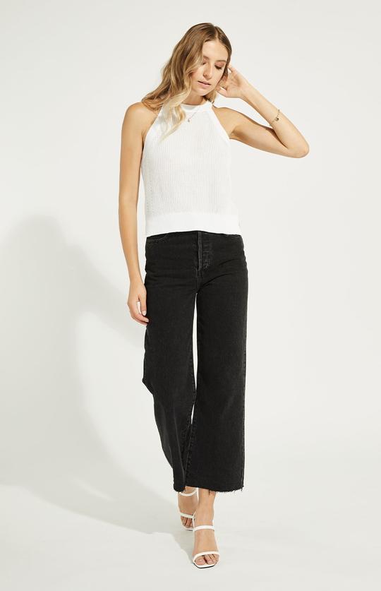 The Vinci sweater tank is made of a super soft yarn. It features a halter neckline, side slits and pointelle stitch detailing.
