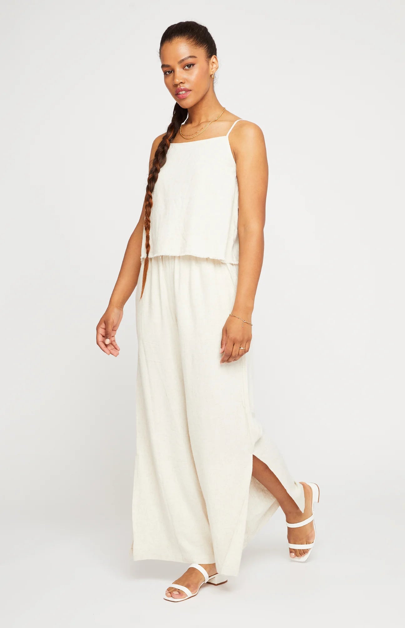 The Willow pant is made of a linen blend that is perfect for warm weather. Features include an elasticated waistband with a ruffled edge, slash pockets, and side slits. Complete the look with the Mikah tank.